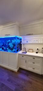 We engineered the cabinetry around the tank’s exact dimensions, with ventilation, lighting access, and concealed plumbing channels for clean aesthetics.