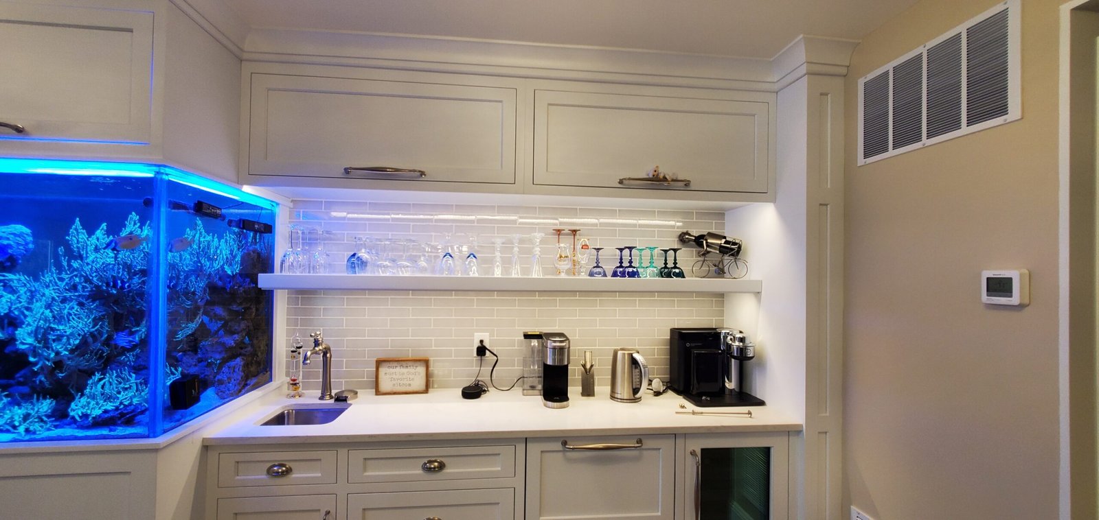 Our team designed and built a fully custom kitchen featuring blue and white shaker cabinetry, timeless hardware, and a stunning built-in aquarium that brings natural tranquility into the home.