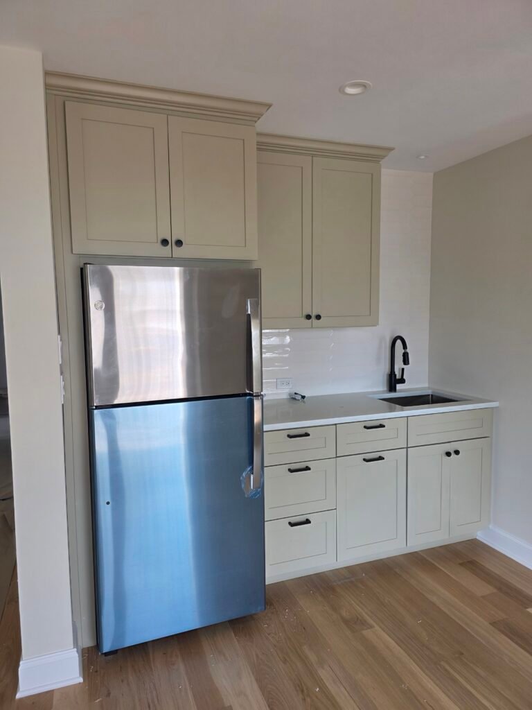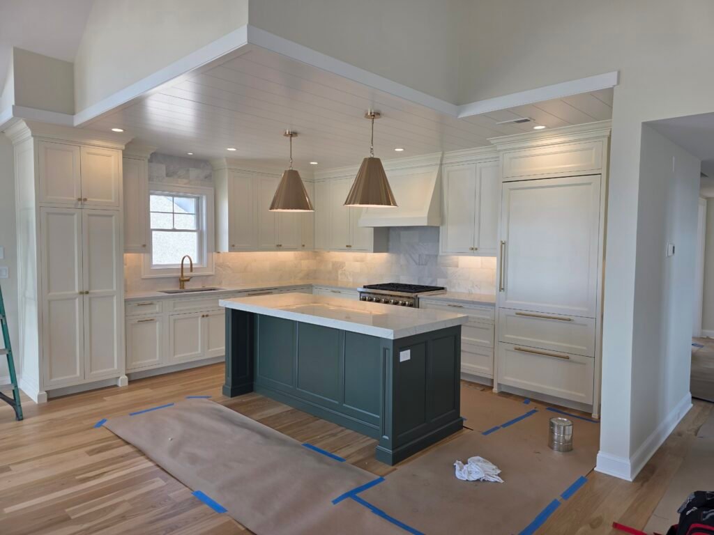 The kitchen is the heart of the house. Here, we designed custom kitchen cabinets in a warm painted finish, paired with a bold contrasting center island. Every door and drawer front is crafted from solid hardwood, carefully joined and finished by hand. The built-in appliances and full overlay cabinetry create a seamless, tailored look, while the crown molding and inset panels add quiet elegance. The island is more than just a workspace — it’s a gathering place for family and friends.