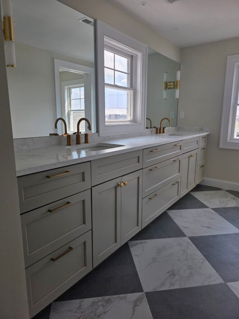 Moving into the bathroom, the same philosophy carries through. A custom double-sink vanity, built with Shaker-style doors and brushed brass hardware, offers both beauty and function. The marble countertop reflects light softly, while the cabinetry provides storage designed for daily living. This isn’t just cabinetry — it’s furniture, built to last for decades.