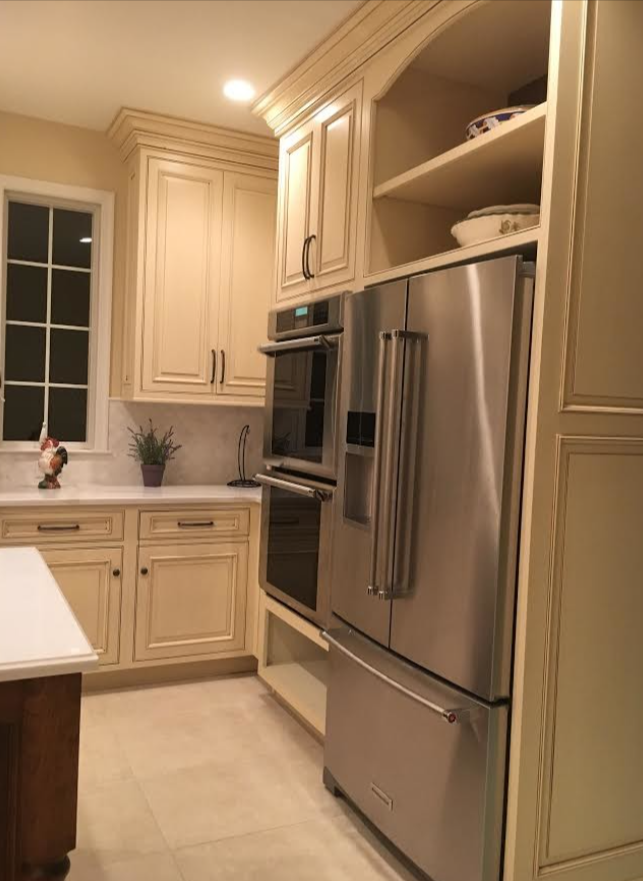 The custom cabinetry was built using solid hardwood frames, finished in a soft antique cream tone with a hand-applied glaze that adds depth and character.