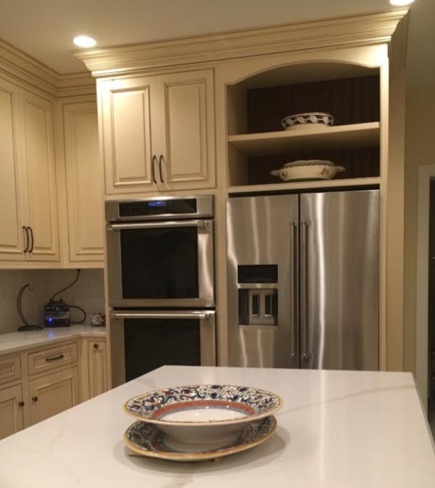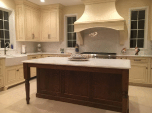 The custom cabinetry was built using solid hardwood frames, finished in a soft antique cream tone with a hand-applied glaze that adds depth and character.