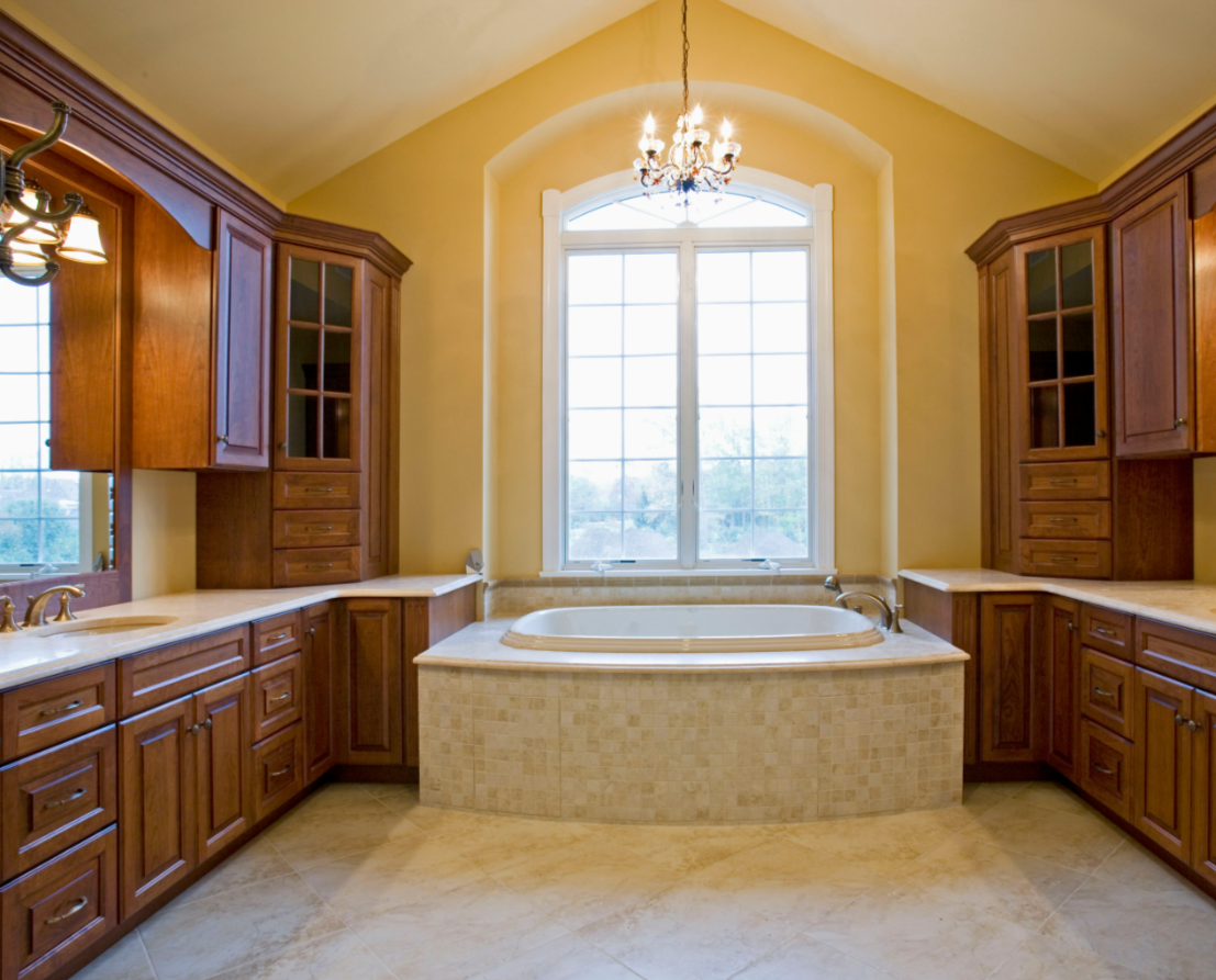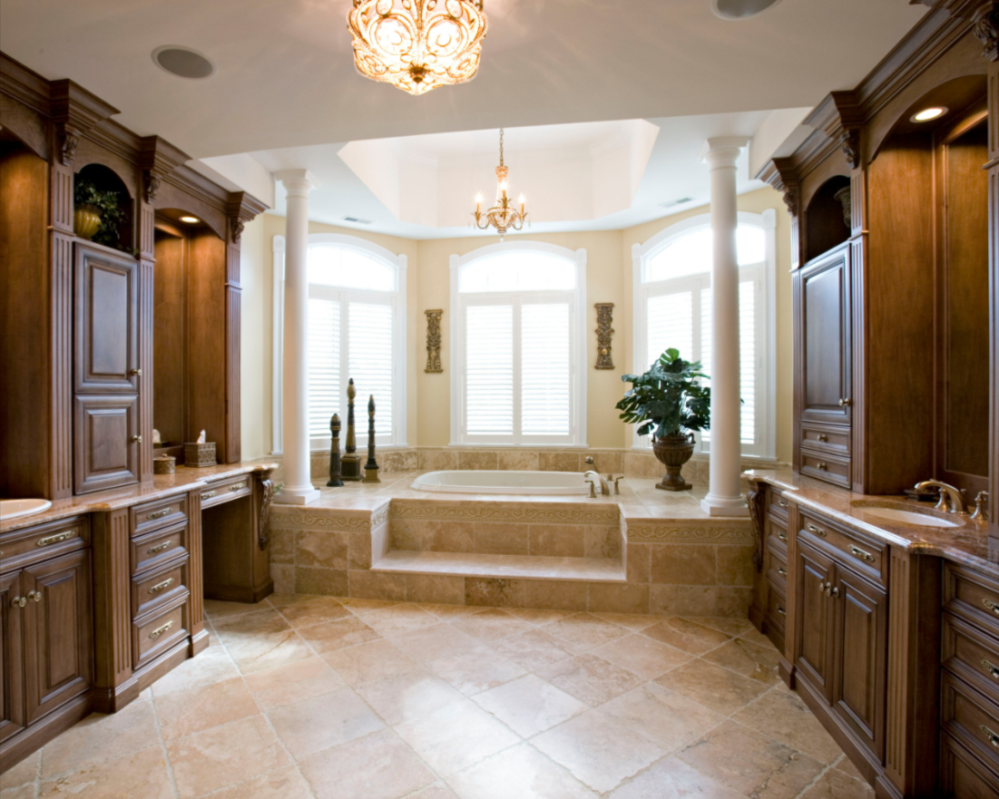 This elegant traditional master bathroom demonstrates how fine craftsmanship and architectural balance can turn a functional space into a personal sanctuary.